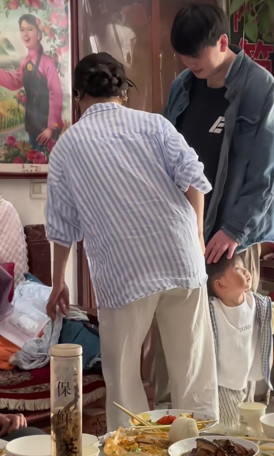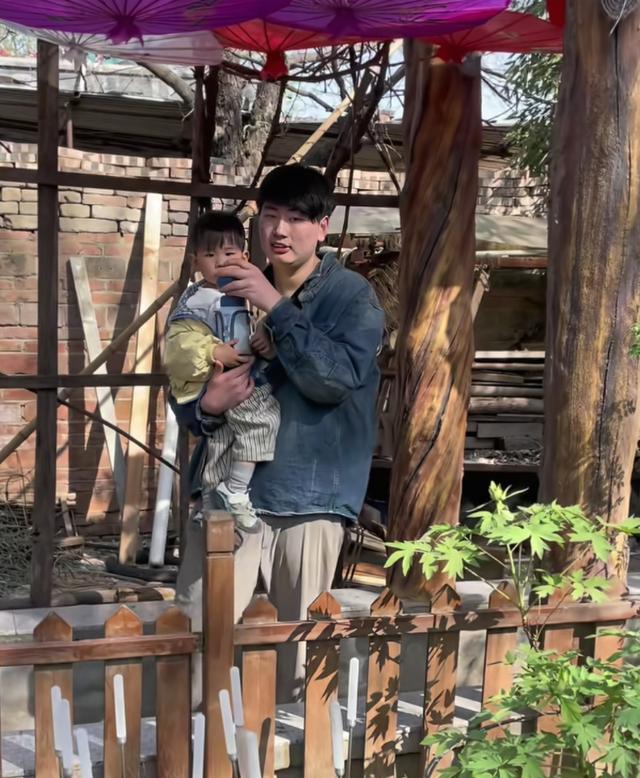另一个画面中,小伟正带着儿子朱发顺在院子里玩耍,大衣哥挺着大肚子在一旁看着。
